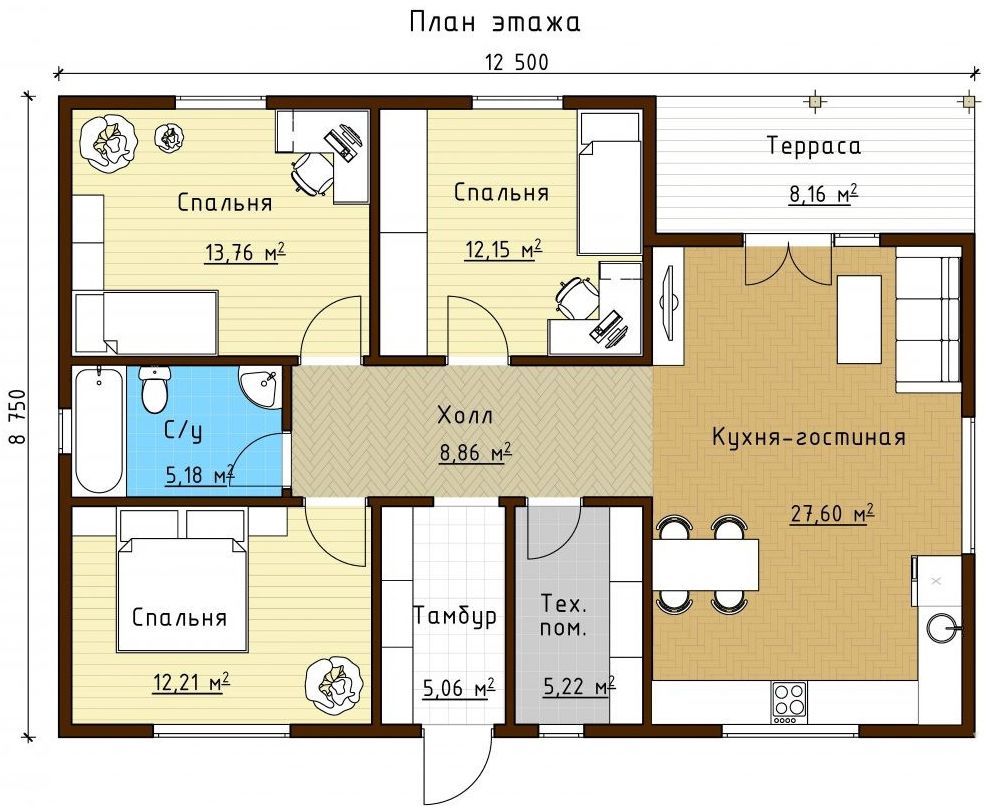 Проект дома Один 109 м.кв. - 3 спальни, 1 этаж