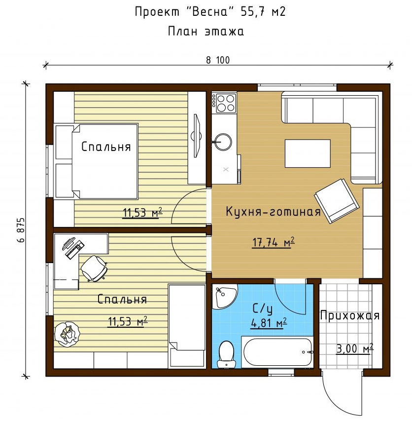 Проект дома Весна: 55,7 м2, 2 спальни, 1 этаж
